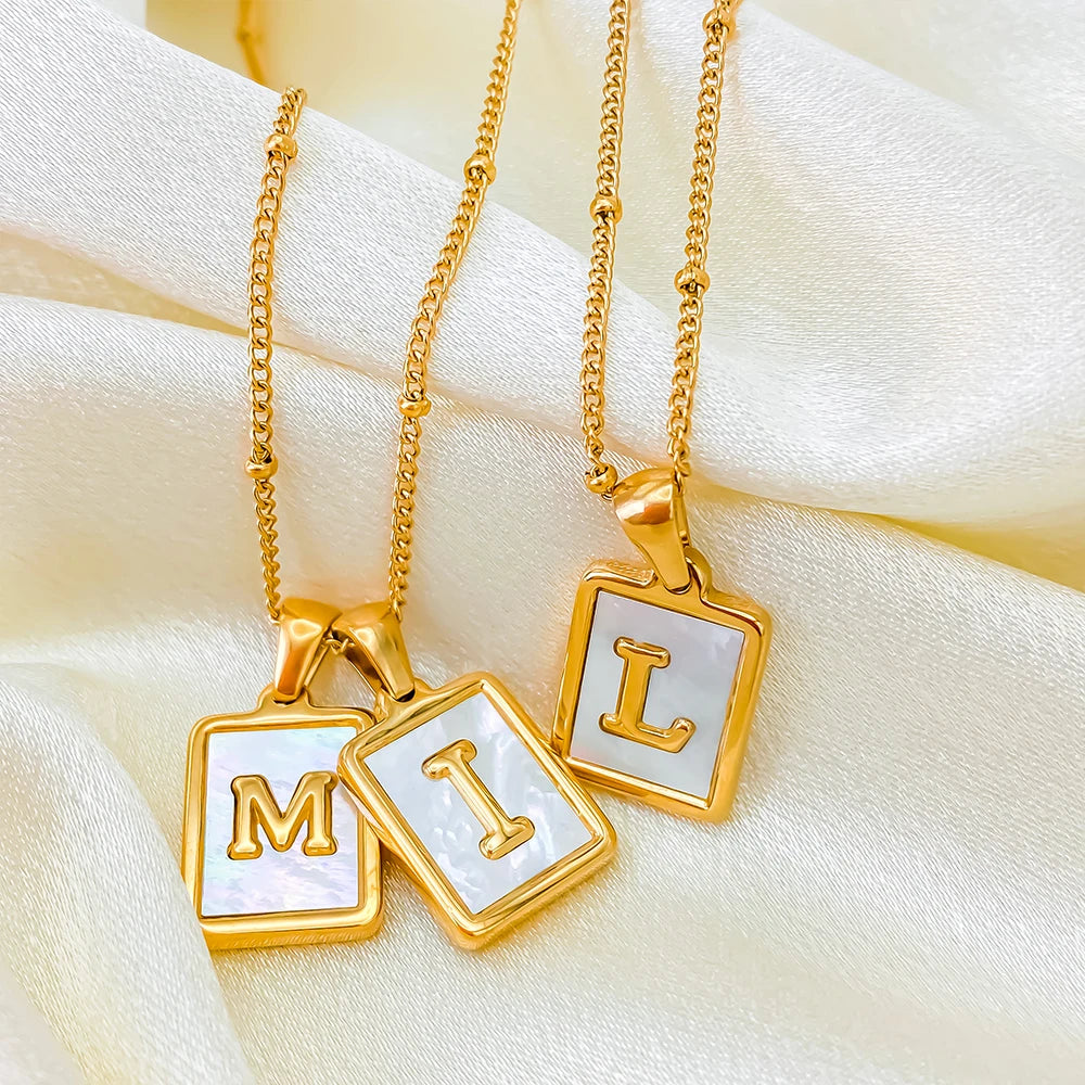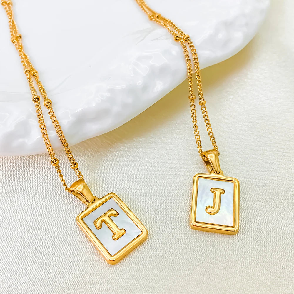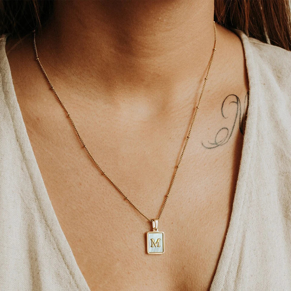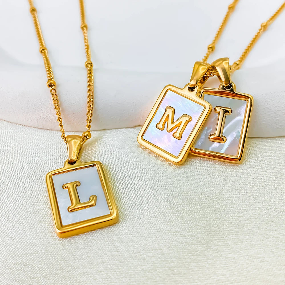 This refined piece features a rectangular gold pendant, set against a white shell background, highlighted by a central gold letter of your choice. The necklace epitomizes simplicity and elegance, making it a perfect accessory for any occasion. Ideal for personal wear or as a thoughtful gift.