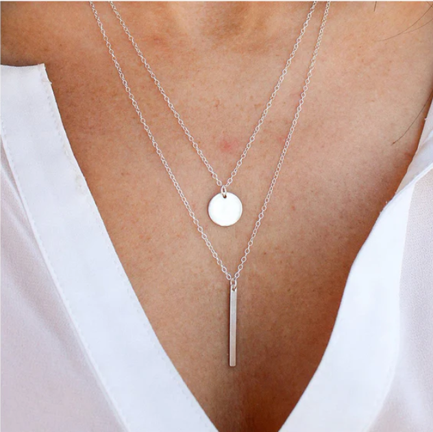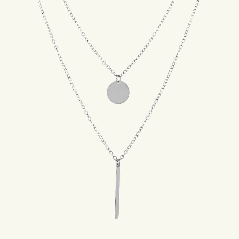 Take a risk and stand out with this daring two-in-one Bar and Disc Layered Necklace. Wear it your way and add some pizzazz to your look with its cute and sophisticated pendants. Dare to make a statement!