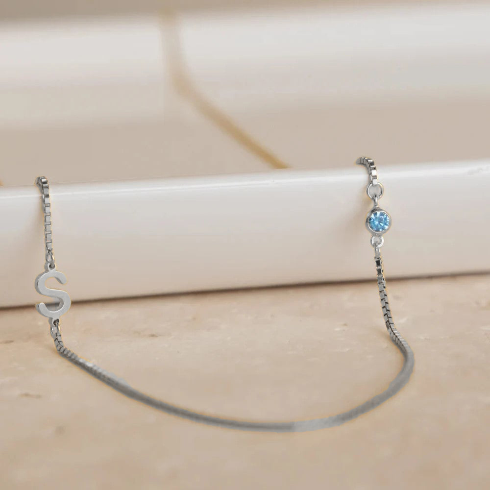 Elevate your jewelry game with our celestial Birthstone Initial Necklace. Each piece is unique and features a personalized initial, representing your individuality and creativity. With this luxurious necklace, you'll effortlessly add a touch of sophistication to any outfit, making it a must-have for the fashion-forward.