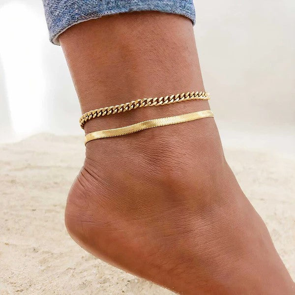 Elevate your summer style with the Skylar Delicate Set of Two Chain Anklets. Featuring a stunning combination of curb and snake chains, these anklets offer an elegant layered look that will complement any outfit. Plus, they are 100% waterproof and tarnish-free, ensuring long-lasting beauty. Make a statement with these luxurious anklets.